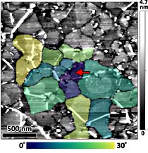 The AFM image shows a graphene/metal nanoparticle hybrid material fabricated by transferring