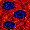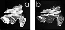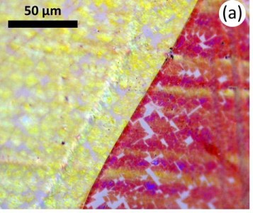 Figure (a) shows a cross sectional transmission electron micrograph (TEM) of a wing scale of a male Albulina metallica. The dark areas are chitin and the light holes are air voids in the chitin.